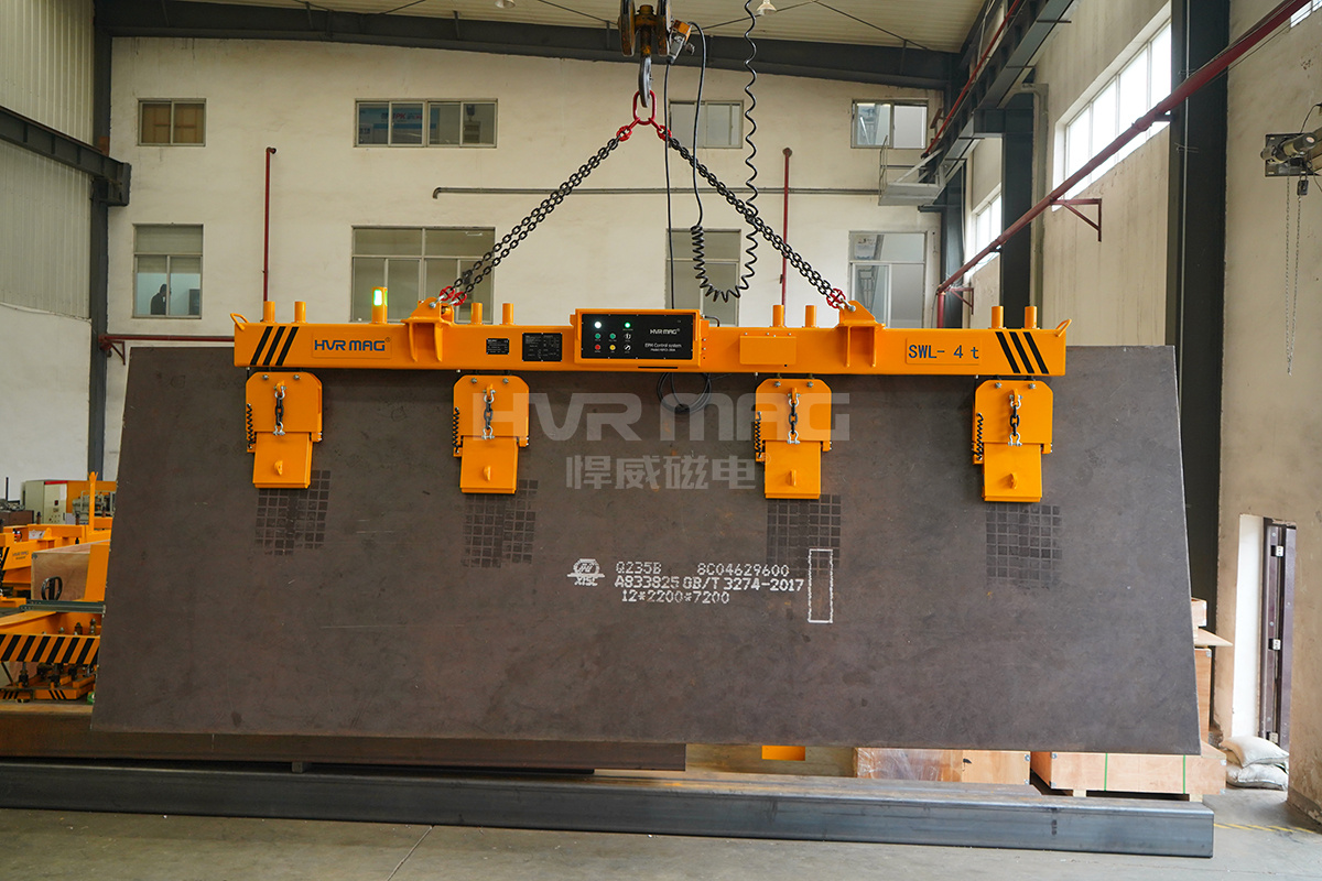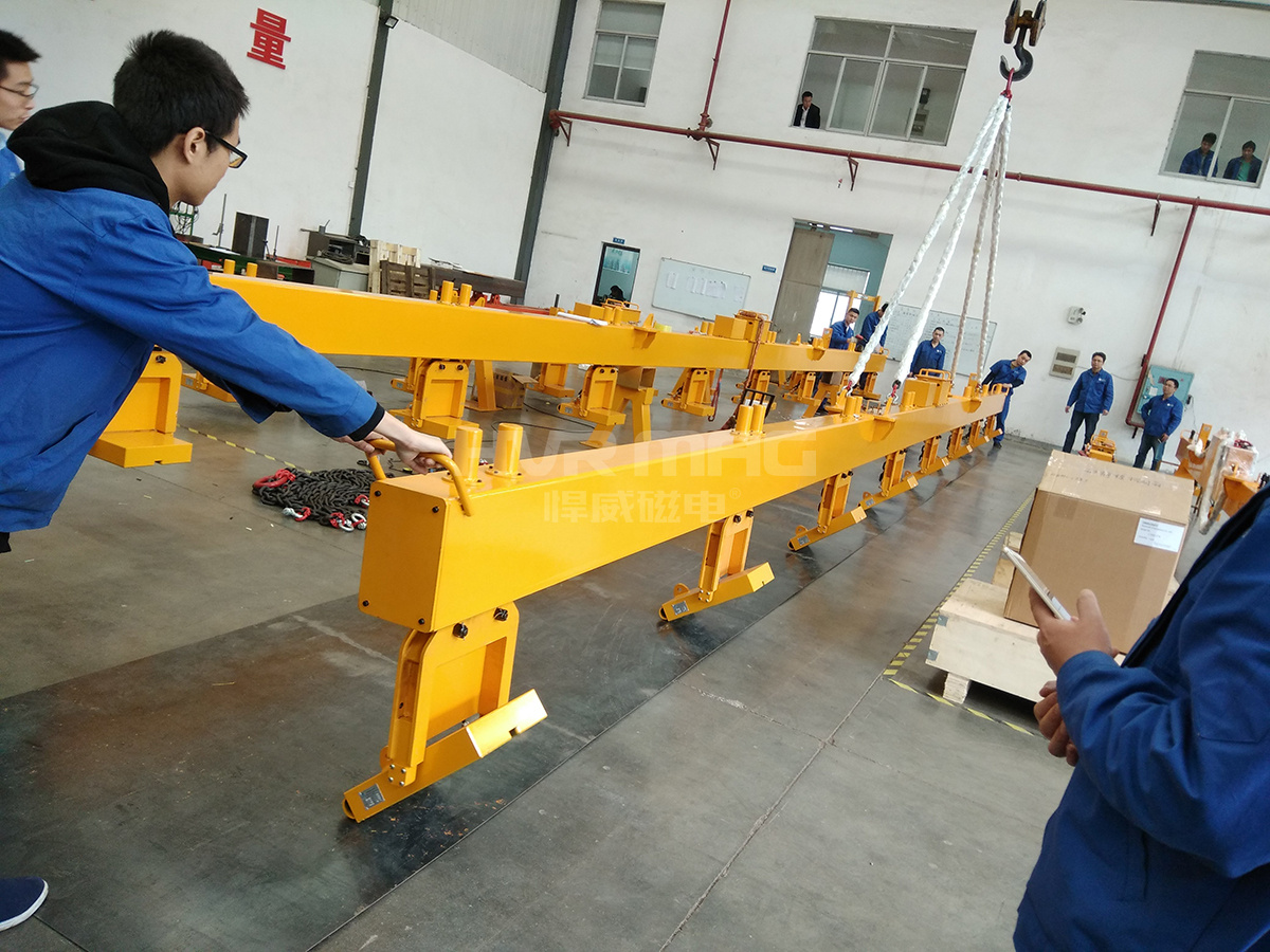 以下是悍威磁电最新生产的一套出口美国的侧吊型钢板吊磁力吊具试吊图,额定起重能力为6吨,采用了6台电永磁铁联合吊运的方式,帮助终端用户实现对钢板安全平稳高效的搬运,技术上已经超过美国,处于技术领先水平