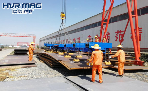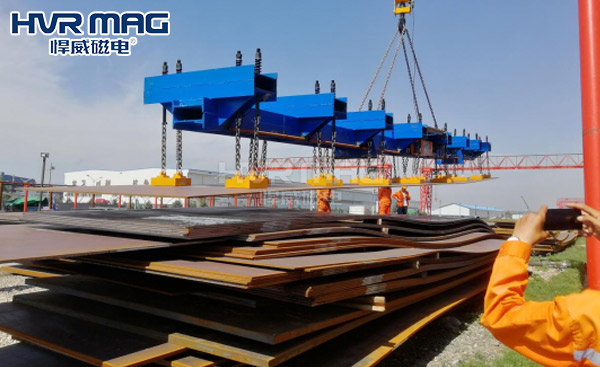 其次,根据钢板的尺寸规格选择具体的吊具。如果车间需要吊装钢板的规格范围变化较大,则可选用悍威磁电伸缩梁电永磁吸盘吊具,或利用多台钢板专用电永磁吸盘吊具吊装的方案搬运钢板。