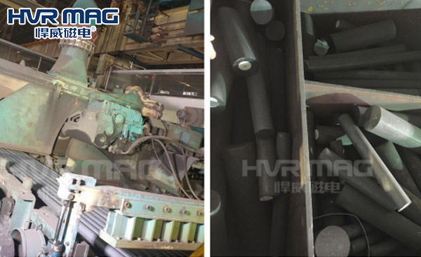 如上图所示,可以看到智能机器人全副武装,原来是因为该客户车间的温度高达600℃,为了确保在高温环境下,不影响智能化设备才有了视频中的画面,那悍威磁电的电永磁铁裸露在外,它是如何适应这一特殊环境的呢?原来悍威磁电根据600℃的高温,选择了耐高温的磁钢,并在添加了水冷系统以对电永磁铁快速降温,使磁铁不受外接热量的影响,确保电永磁铁吸力大小,从而实现高温状态下对圆棒的高效分拣。
