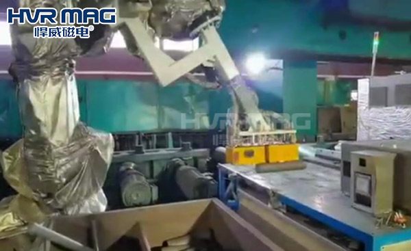 悍威电永磁铁配合智能机器人搬运高温圆棒
