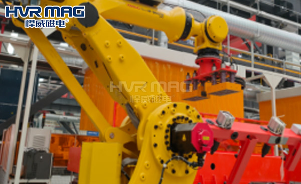 悍威磁电使用2台HEPMP-2715P45X12-GW高温电永磁铁联用到机器人上,搬运最重80公斤方管结构件(F80X80X壁厚6-8)到夹具组焊,实现自动化搬运上下料。