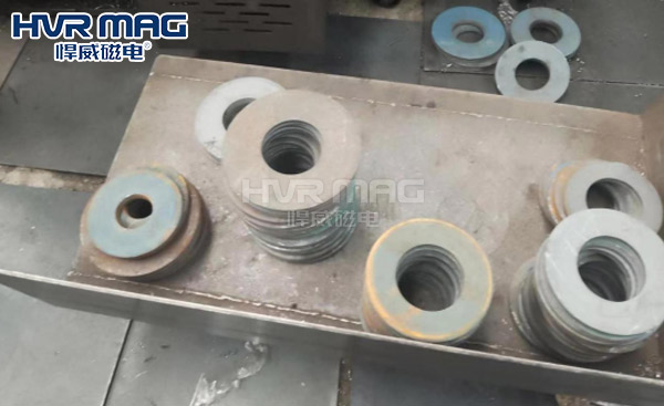 首先客户的工件外径有150-250mm不同大小,但是内径基本固定在3种大小,厚度也是固定的,由于客户需要全部采用一套电永磁进行搬运,需要考虑全部的兼容性。我们就根据内径的相差不大的特点,选择使用圆形磁铁布置在内径周边位置,考虑到需要进行翻转动作,采用了直径40mm,吸力20KG的4个圆形磁铁搬运。内径这个地方所有的工件基本都有相交叉的吸附面积,这样就完成了所有工件的兼容性。