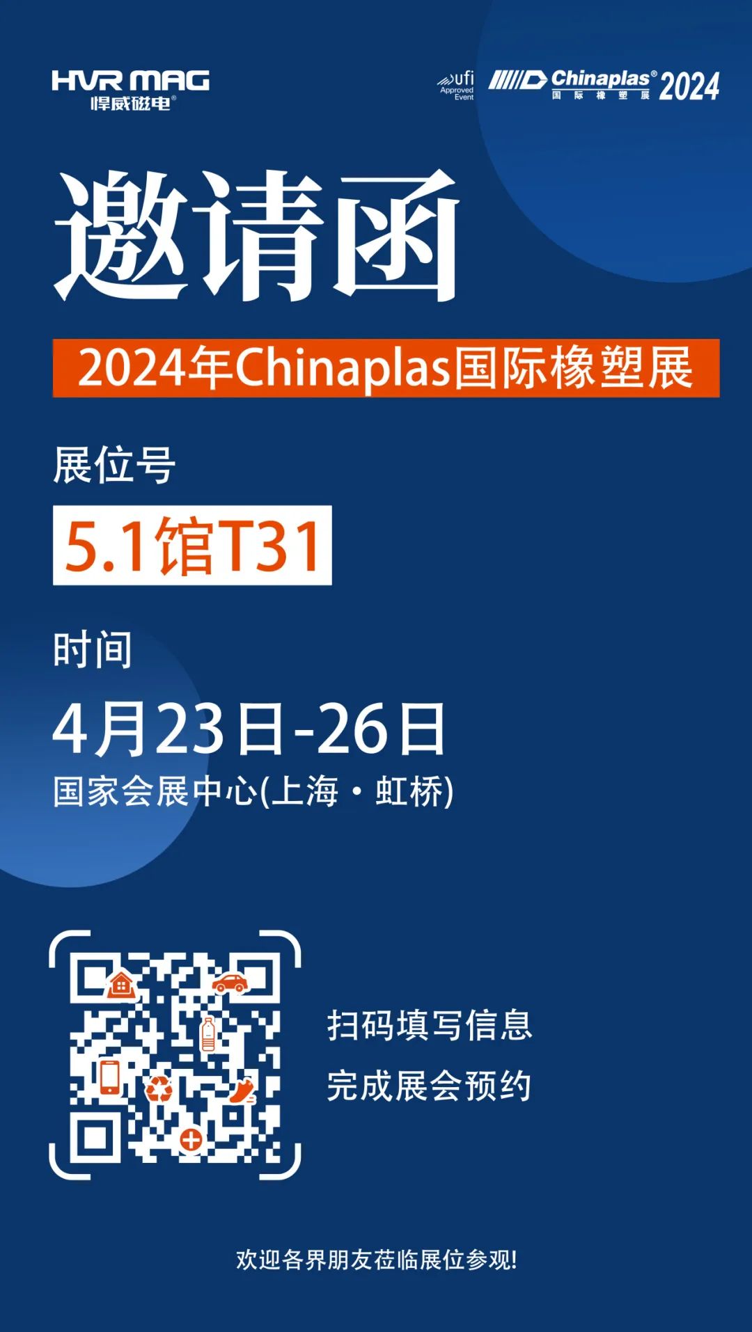 第三十六届中国国际橡塑展会将于2024年4月23日-26日在上海虹桥国际会展中心举行。悍威磁电将携电永磁快速换模系统亮相本展会。我们在5.1馆T31恭候您的光临。