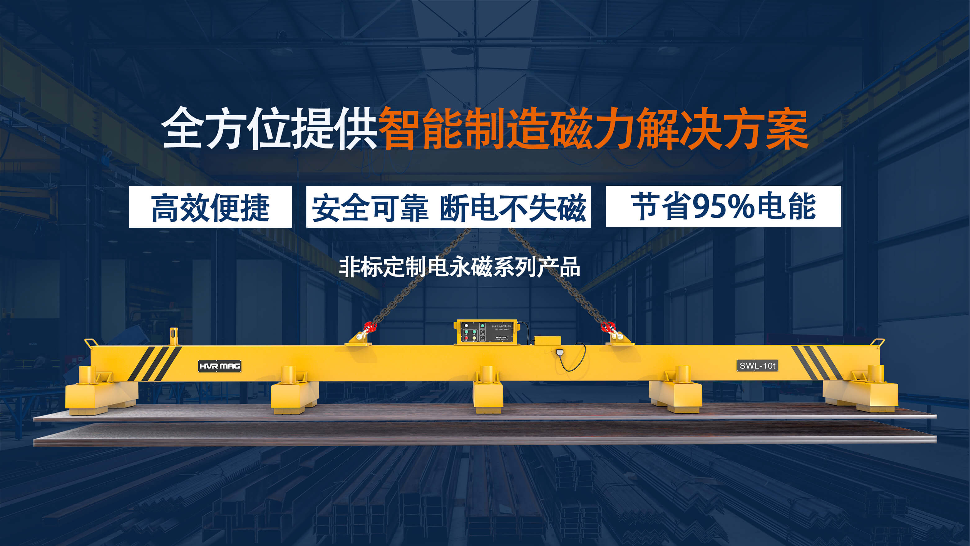 哪里有钢材起重搬运,哪里就有悍威磁电。悍威磁电深入磁力起重行业15年,以电永磁铁为核心,为起重机、机械手等自动化设备提供电永磁吊具、电永磁夹具,解决工业自动化钢板、钢管、型钢、异型钢等钢材的智能抓取、搬运、焊接固定等难题。
