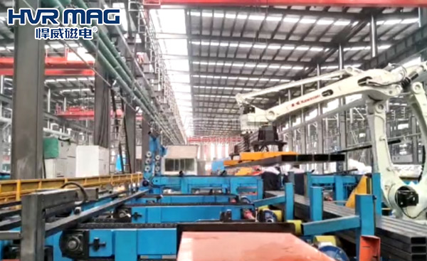 面对液压夹具所带来的困扰,该智能装备公司决定重新为车间的工业机器人挑选合适的末端抓手。既然液压夹具不行,那就试试真空吸盘、磁力吸盘。经过多方面参考与对比,该公司最终选择了悍威磁电机器人专用电永磁夹具搬运成排方管。