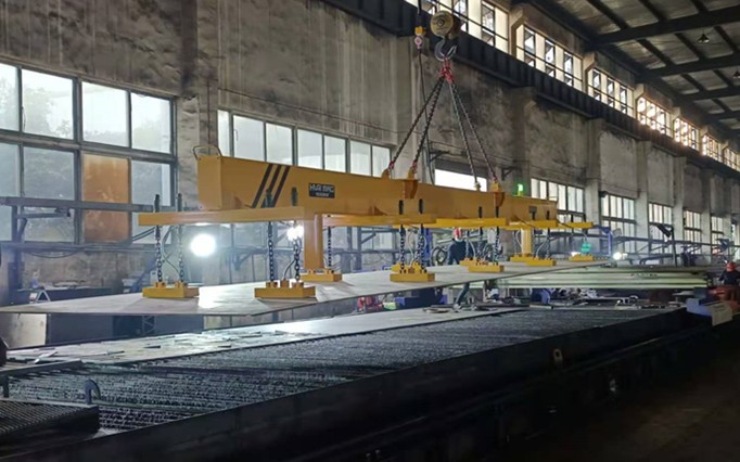 悍威磁电,最新交付客户的钢板切割上料装置,一套由10台HEPMP-800P50电永磁铁组成的,起重能力8吨的磁力吊具,联合吊运12m长,≤3.5m宽,≥4mm厚的钢板,单张钢板最重不超过8T
