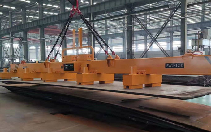 在山东某煤矿设备制造商的车间里,钢板夹和吊钩曾经是他们用来搬运各种尺寸的钢板和切割件的主要吊运工具。但现在,却不再是了,因为他们从悍威磁电最新购买了一套钢板磁力吊装设备,钢板磁力吊具。