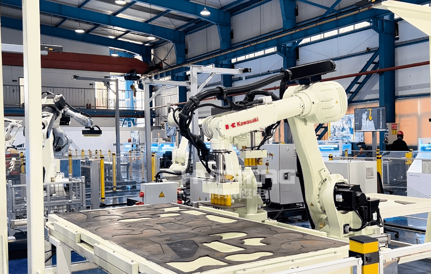 第二种解决方案,是采用机械手+电永磁吸盘的组合模式,适合追求全流程自动化、产能需求较高的大型船厂。这种方案的核心优势的是实现“上下料+分拣+码垛”全流程自动化,彻底解放人工,大幅提升钢板切割上下料效率。在上料环节,电永磁吸盘同样通过PLC控制系统,根据钢板的长宽厚,自动调节磁力大小,精准实现单张钢板上料,做到不多不少只吸1张钢板切割上料,有效避免钢板磕碰、划伤。值得一提的是,如果船厂生产中涉及少量不锈钢钢板,无需额外更换夹具,可采用真空吸盘与电永磁吸盘的混合搭配模式,一套机械手吸盘夹具就能轻松适配各种尺寸、各种材质的钢板切割上料,省去频繁更换工装的麻烦,提升作业灵活性。钢板切割完成后,3D视觉系统会快速扫描识别切割后的小零件,精准定位每个零件的位置和尺寸,引导机械手携带电永磁吸盘,将不同规格的小零件逐一吸附并运送至传送带上;传送带运转过程中,各工位的机械手会再次通过电永磁吸盘,将传送带上的零件按规格精准码放到对应料框中,整个过程全程无人干预,既保证了分拣码垛的精准度,又避免了人工操作带来的误差和损伤,真正实现了钢板切割上下料全流程自动化。这种协同模式可与激光切割机、MES中控系统等深度联动,进一步提升产线智能化水平。