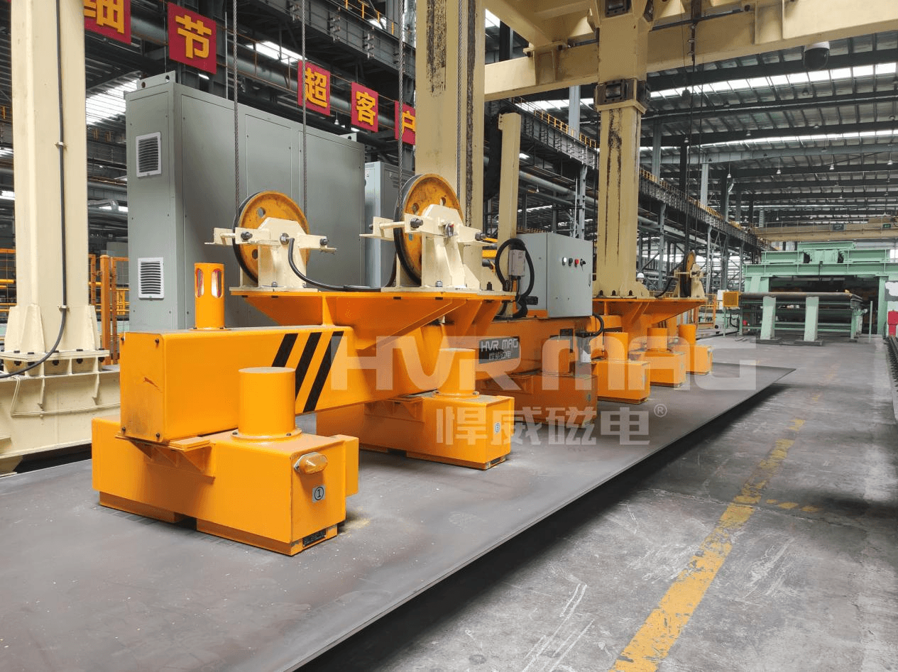 第一种解决方案是采用智能行车+电永磁吊具的组合形式,这是目前中小船厂应用最广泛、性价比最高的一种方式。这种方案无需对现有车间进行大规模改造,只需在原有行车基础上升级为智能行车,搭配钢板切割专用的悍威电永磁吊具,就能快速实现钢板自动化上下料。在钢板切割上料环节,电永磁吊具通过PLC控制系统精准发力,可根据钢板的厚度、重量智能调节磁力,实现单张钢板的精准吸吊,有效避免多张钢板粘连吸附的问题,确保上料精准高效。待钢板切割完成后,电永磁吊具可一次性完成整板零部件的整体下料,摆脱了对人工的依赖——再也不用工人蹲在激光切割平台旁一点点捡料,激光切割机可实现24小时不停机连续作业,大幅提升生产效率。而且悍威磁电生产的电永磁吊具,仅充退磁瞬间1-2秒耗电,全程节能又安全,哪怕遭遇突发断电,也能牢牢吸附钢板,杜绝高空坠落隐患,完全适配船厂复杂的作业环境。
