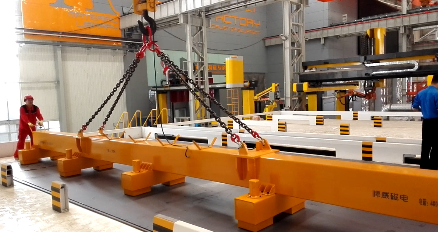 解决方案:设计用10台HEPMP-1000P50按2行5列布置联合吊运,吊具磁铁可分组控制,适应不同长度钢板吊运,磁力可调,满足了客户不同板厚钢板一次吊运一张,不粘连第二张的要求,且无需人工分板,全程无线遥控器操作,只需一名工人且劳动强度低,充退磁时间<2S,不但降低了工人数量和劳动强度还提升了吊运效率,且钢板表面无划痕产生,吊运时不要电,吸力永久保持,具有极高的安全性。