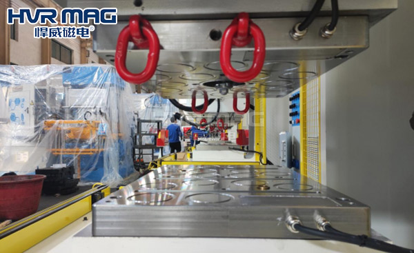 悍威磁电磁力快速换模系统采用电永磁原理,吸附导磁性模具,可实现对模具的快速夹持与固定。悍威磁电根据客户工况需要,为该客户定制化生产了一套型号为HQMCT-0040SC-T1-HT小型立式注塑机磁力快速换模,目前该套磁力换模系统已经运用在客户车间之中。