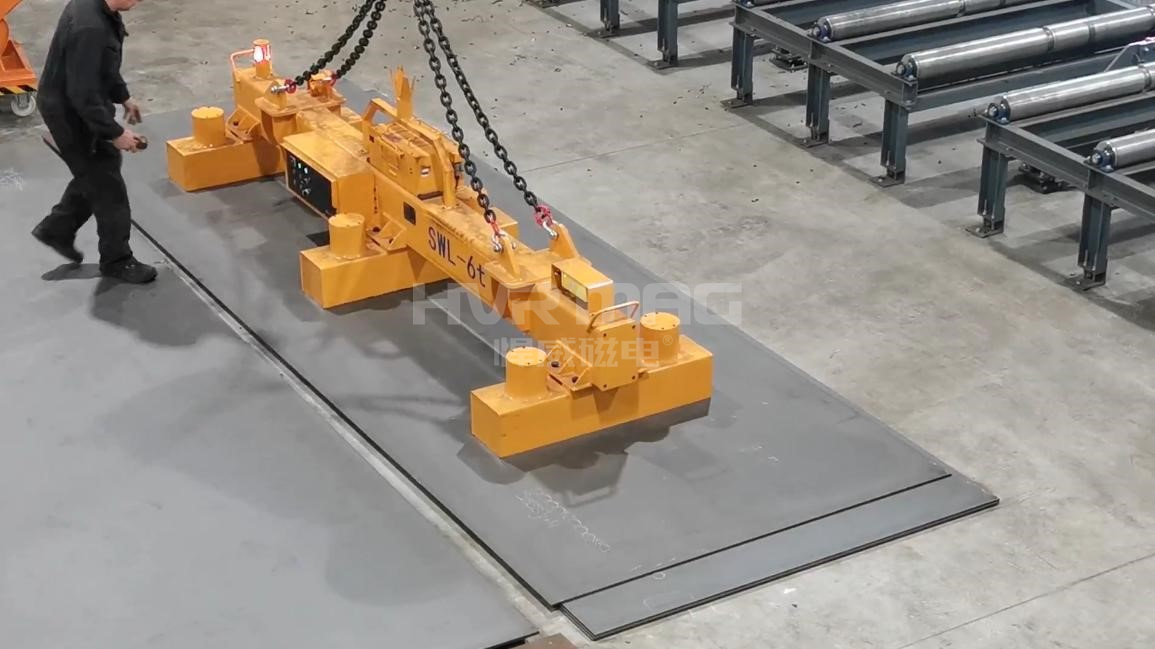 专注磁力起重技术的创新与研发十多年,悍威磁电的充电式钢板磁力吊具,让您的钢板搬运更灵活安全更有保障!
