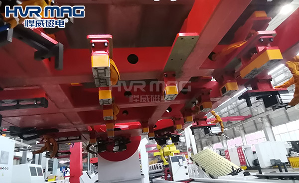 此前国内某自动化集成商与悍威磁电合作改造自动化集成焊接流水线项目,该项目原先用人工拼焊夹具和压板进行加工,每5人操作一套工装,经过改造后焊接固定工装采用了悍威磁电特制的电永磁铁进行加工,一人可看一条流水线,通过电永磁铁进行工件的固定,全程外接PLC设定程序,整个生产环节基本可以自动化,帮助企业优化了生产环节以及生产效率。