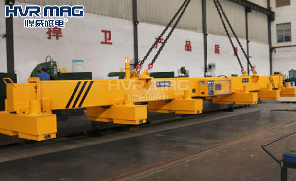 悍威磁电研发设计了一款带有伸缩梁的起重电永磁吊具,这种起重电永磁吊具可以通过横梁来进行伸缩,当搬运不同尺寸的钢板时可以通过控制横梁的长度以此来适应不同的钢板,这种起重电永磁吊具磁力吸附均匀,不会造成钢板变形或者损伤,完全可以满足多尺寸钢板工业车间的应用需求,可以安全、高效地进行吊装搬运,减少工人吊装时间,提升工作效率。