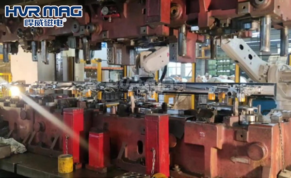 在全自动PLC锻压生产线上,用于EOAT(机械臂末端工具)的15个端拾器磁力夹具有助于轻松装卸金属锻压工件。悍威磁电机械手端拾器磁力夹具助力锻压生产线智能制造,实现精益化生产,打造全自动智能车间。