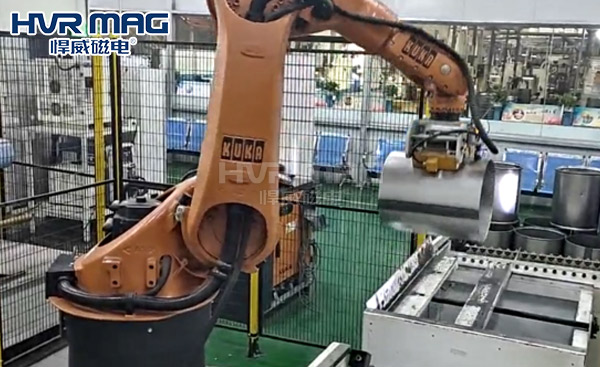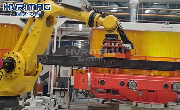 在自动化生产车间,工业机器人吸盘抓手是自动化搬运、码垛的主要末端抓取设备,它决定着工业机器人能否将工件顺利搬运至指定位置,且不对工件表面进行刮伤。机器人吸盘抓手的种类有很多种,如:气动夹具、真空吸盘以及磁力吸盘等,今天悍威磁电小编给大家介绍的是由电永磁铁构成的机器人电永磁吸盘。