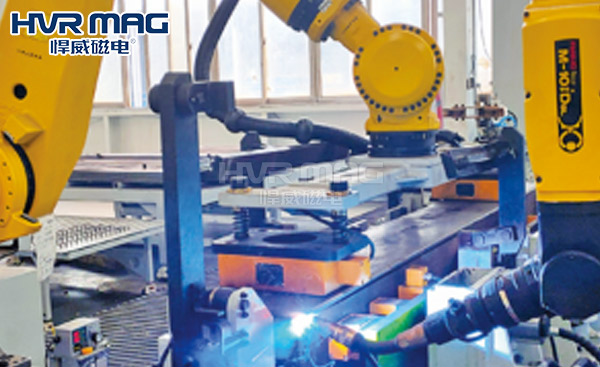 悍威磁电机器人磁力抓手不仅可以满足各种工件的抓取还可以充当磁力固定工装,满足自动化生产的另一大应用,使用电永磁铁将工件牢牢固定,再让焊接机器人自动化焊接,这样既能保证定位的精确性,还可以提高焊接效率,让整个工序全自动化,可随时响应未来不断变化的生产需求。