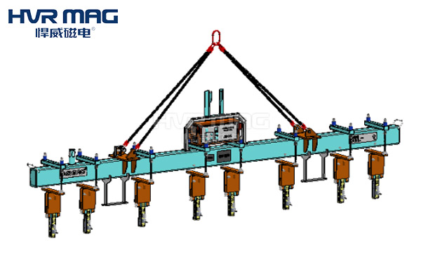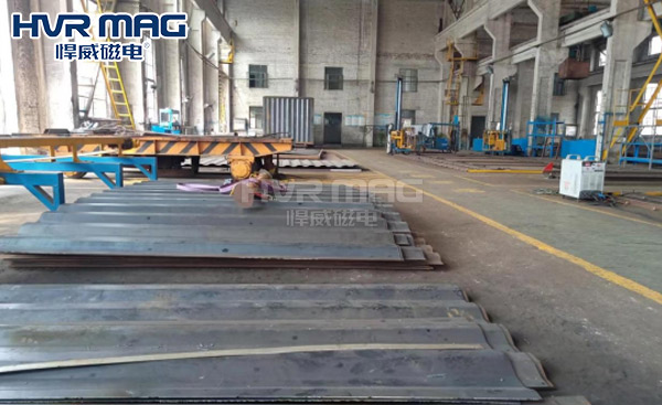 首先在设计搬运瓦楞板的时候株洲悍威磁电科技有限公司会根据客户焊接好的瓦楞板大小设计好每块磁铁的摆放位置,如果每次的摆放位置有不同地方,我公司可以设计成直线导轨的方式进行手工移动。在客户焊接箱体之前瓦楞板需要侧吸放在箱体侧边,以前都是用的夹钳夹住后进行搬运,这种搬运方式把瓦楞板搬运到指定地方需要几个人工按住瓦楞板才好进行焊接工作,不然无法完整的对齐。客户在使用电永磁铁进行搬运后只要将电永磁铁侧向吸住钢板的一面,对齐整个箱体的焊缝位置就可以直接进行焊接,节省了人工和提高工作效率。另外一点用夹钳搬运的时候瓦楞板也是侧吸的,容易导致瓦楞板出现掉落的风险。株洲悍威磁电设计的电永磁吊具结合搬运时候的侧向摩擦力,确保工件在搬运时候的安全性能。使得工人放心大胆的在工位上进行焊接工作。