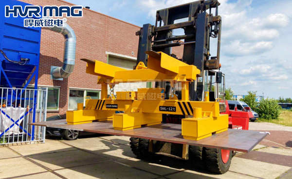 叉车配套蓄电式电永磁起重器还可以根据钢板规格进行多点联吊布局,不同规格的钢板布局不同的磁铁数量,从而保证电永磁起重器能完整吸住钢板进行整体搬运,均匀的磁力让钢板在搬运时不会出现钢板变形、弯折等问题。