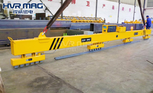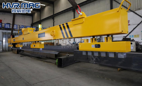 这款电永磁铁的设计之初只要是考虑到客户工厂需要搬运的工件种类非常的多,采用一套能够兼容的电永磁吊具可以给客户节省很多的人力和物力。这款磁铁从设计在底部添加落地检测装置,只有当工件放下才能使电永磁吊具充磁和退磁,在空中搬运对吊具没有一点影响。该电永磁吊具采用蓄电池设计,可以使用在多个不同的行车,不用局限于一台行车进行搬运。底部磁极采用凸出30mm的设计可以完美兼容工字钢或者H型钢的搬运,并且我们株洲悍威磁电的电永磁设计还可以对工字钢进行翻边,翻遍后吸取适合加工的面。