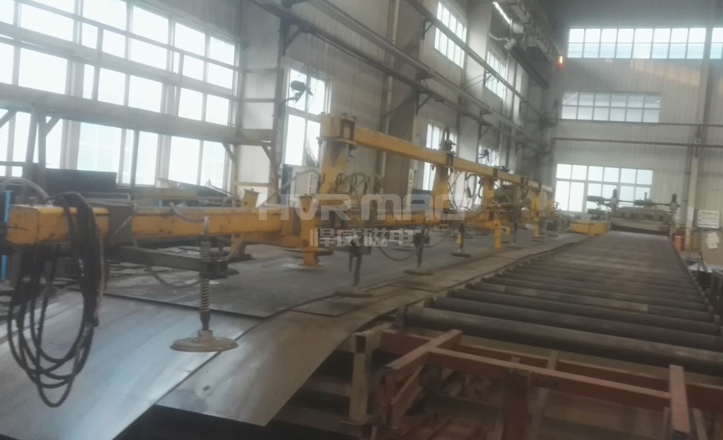 通过改进整体技术方案,悍威磁电用32个电永磁铁的吊装方案吊装16米长的薄钢板,开创了国内最长薄钢板吊装案例的先河。