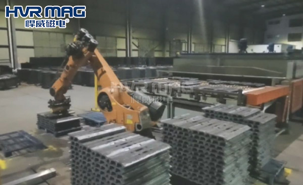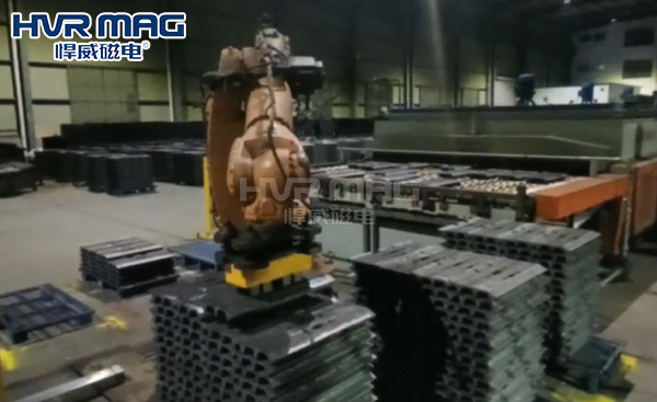 如下图显示的是一个工业机器人在车间操纵履带板。该机械臂负责将履带板切割件从输送线上卸下,然后将其逐个放在指定的托盘上,该工厂之前使用的机械手末端夹持装置是电磁抓手,如今换成了电永磁抓手。那么,是什么改变他们对于机械手末端夹具电磁铁的想法呢?