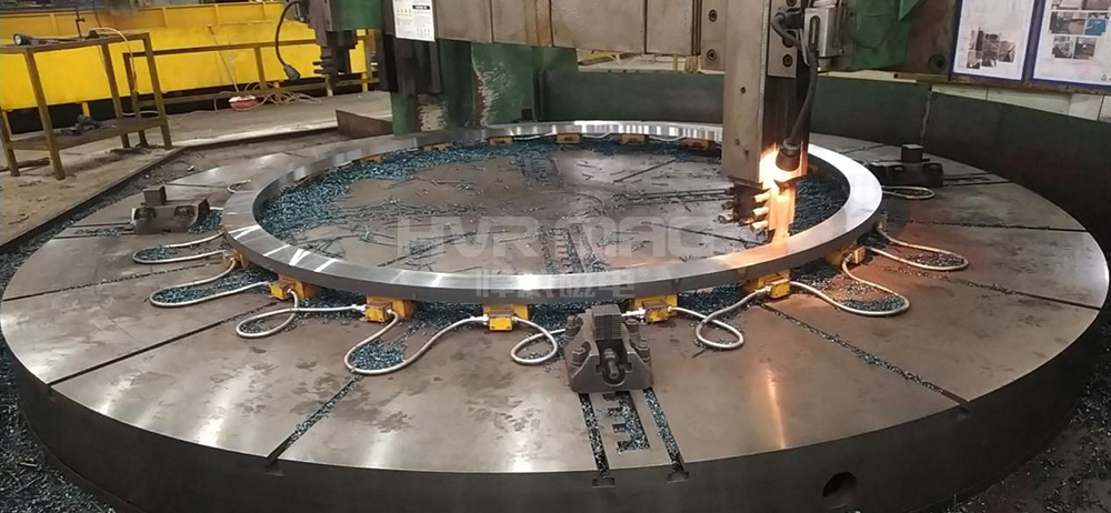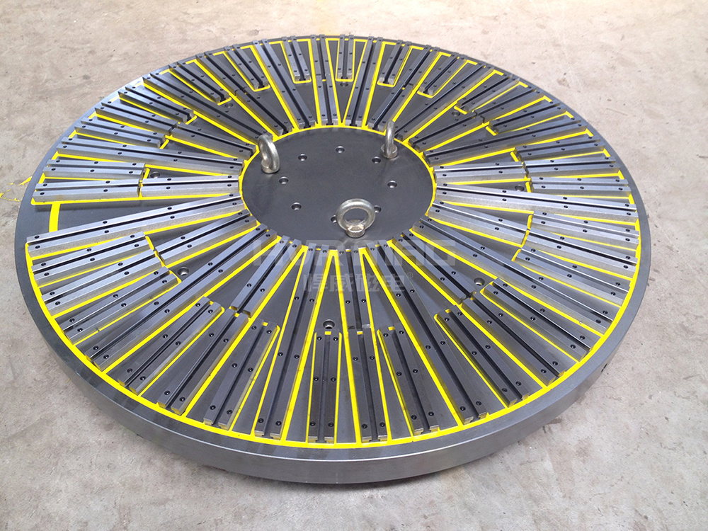 由于电永磁吸盘的磁吸力均匀稳定,可以通过控制器控制充退磁,还可以和数控机床PLC系统连接,非常适用于大型自动化车间生产线。下图的数控立车加工台面,就用到了悍威磁电的电永磁吸盘来对加工的风机垫片进行固定。