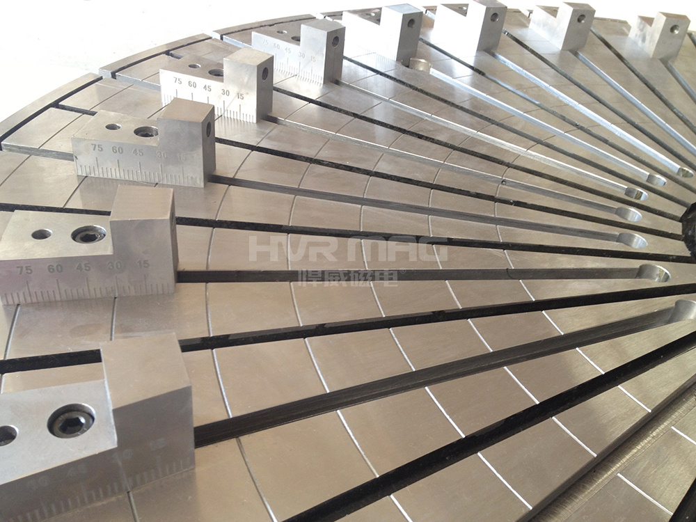 针对这种特殊的圆形工件,悍威磁电提供的设计方案是用多台双面电永磁吸盘组合使用替代原有夹具,每台吸盘上下两面均有磁力,可以自由组合摆放,用于不同工件的加工,相对传统的电永磁吸盘,大大节约了企业的采购成本。