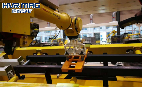 随着国内智能化生产的兴起,码垛机器人被应用于很多的大型生产线,主要用来代替人工来完成大量重复的工序,节省人工成本,提高生产效率,作为生产前的准备工序,钢板的搬运与码垛是很多企业头疼的问题,对此悍威磁电研发生产了码垛机器人专用电永磁夹具,本篇小编来为大家详细介绍下。