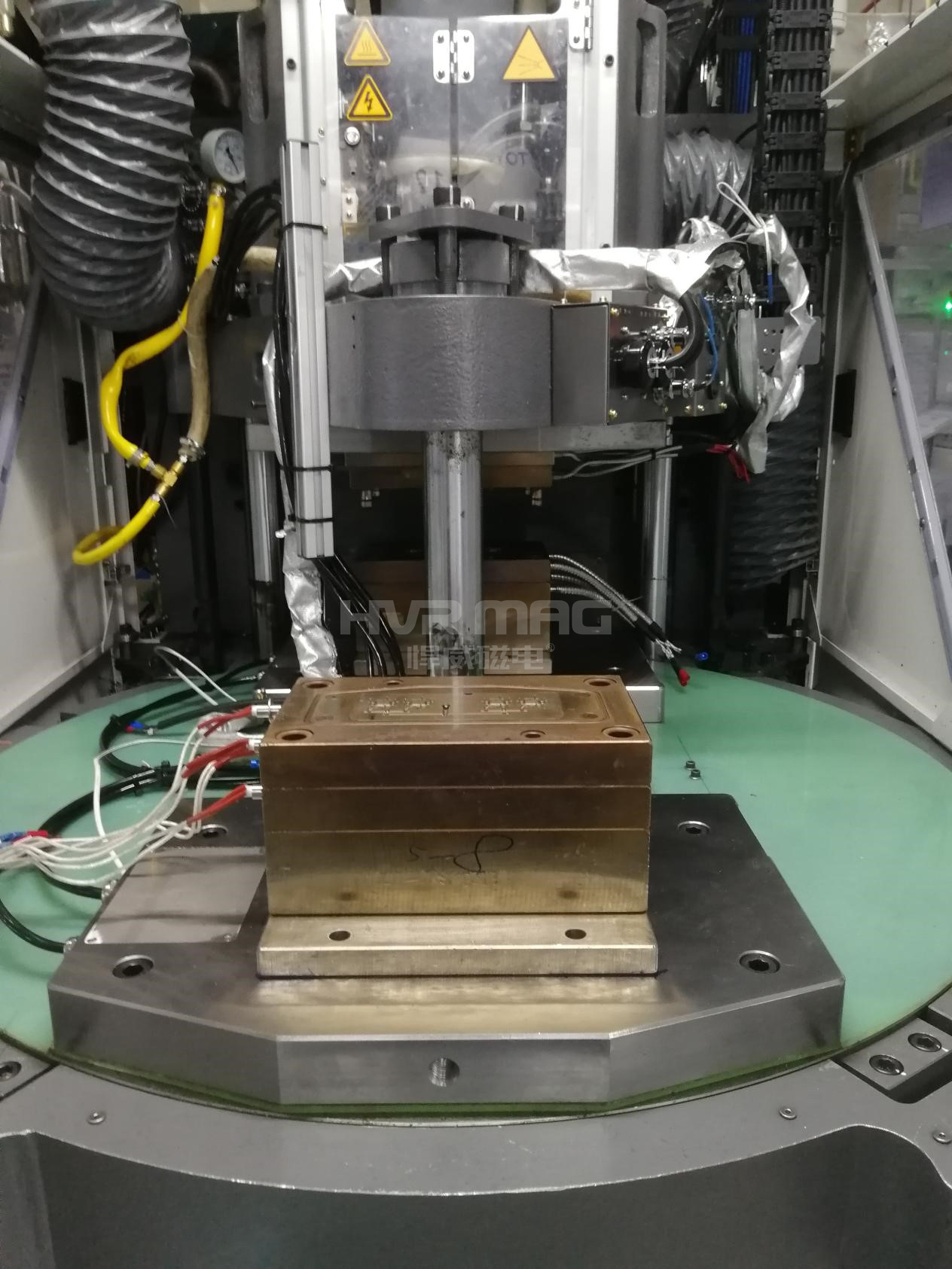 如图中所示,就是悍威磁电的磁力模板在40吨立式转盘式注塑机上的应用,包含两块磁力静(下)模板以及一块磁力动(上)模板。不管是卧式还是立式,悍威磁电都能依据机型和模具参数,定制化生产磁力快速换模系统。