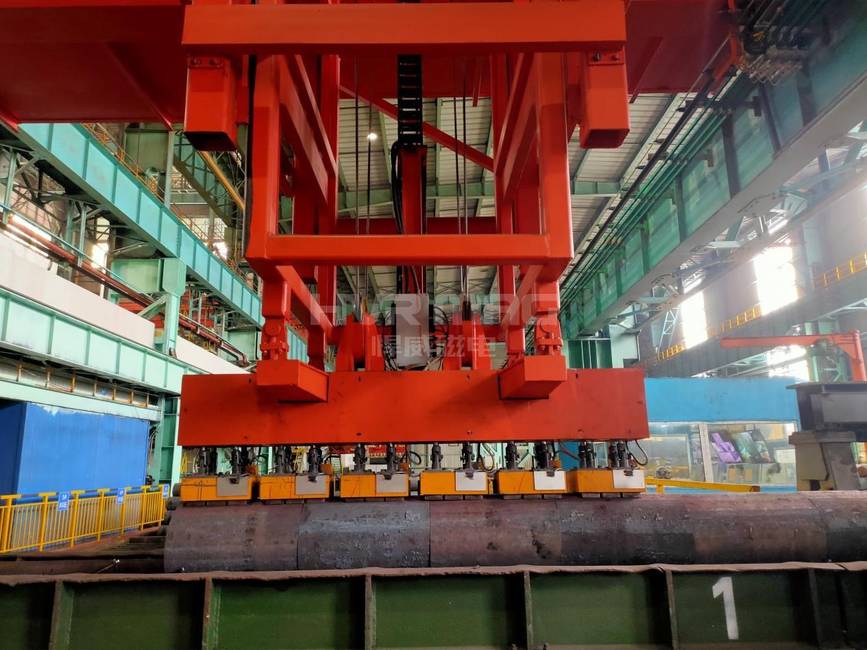 下图所示的智能起重机,配备了悍威磁电定制研发生产的6台型号为HEPMSP-600P70S的电永磁铁,通过配套的HEPC5-900A-T01电永磁控制器,实现单独控制每台磁铁(PLC端输出控制)。