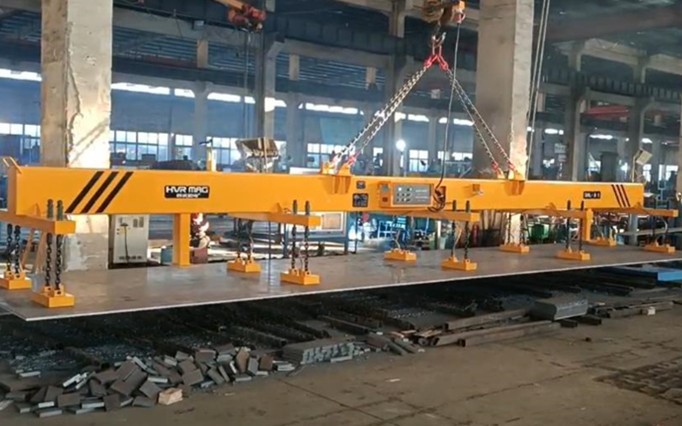 悍威磁电,最新交付客户的钢板切割上料装置,一套由10台HEPMP-800P50电永磁铁组成的,起重能力8吨的磁力吊具,联合吊运12m长,≤3.5m宽,≥4mm厚的钢板,单张钢板最重不超过8T