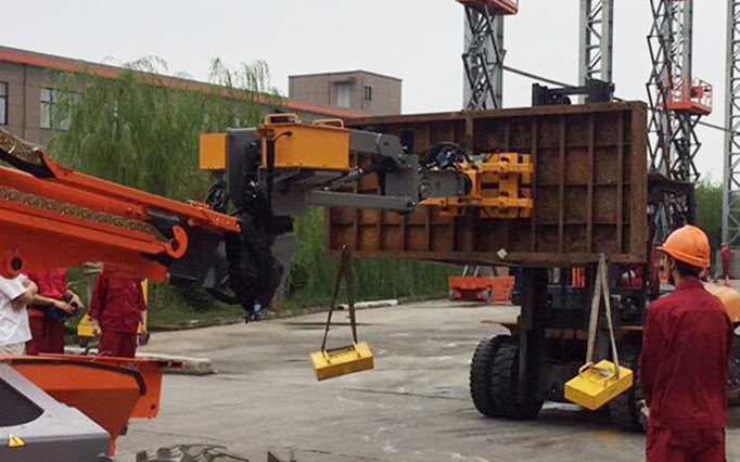 由悍威磁电专门设计生产的充电式磁力吊具,安装在高空作业平台车的末端,形成了一种独特的可灵活移动的磁力搬运设备:可以从叉车上抓取模板,与平台车一起将其搬运到室内车间,最后将其放置到指定的位置。