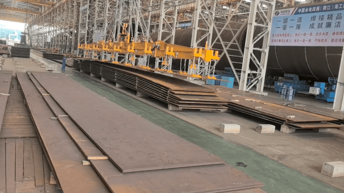 在碧波万顷的南海之滨,阳江海工基地的作业现场海风凛冽,空气潮湿且富含盐分,对各类机械设备构成了严峻的考验。这里,中国水电四局(阳江)海工基地正承担着大型风电结构件的制造重任,其中,长达6至26米、重达数十吨的钢板卸车、转运与上料,曾是生产线上的一道难题。传统的人工钢板钳作业,不仅劳动强度巨大,效率受限,更在钢板表面留下难以忽视的划痕,为后续精加工环节埋下隐患,同时,近距离操作带来的安全风险始终如影随形。风电制造业共性挑战——大尺寸、大跨度钢板的安全、无损、高效搬运,在此刻显得尤为突出。