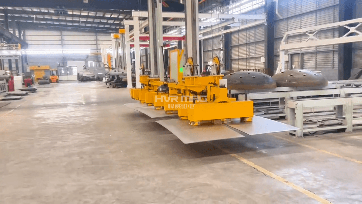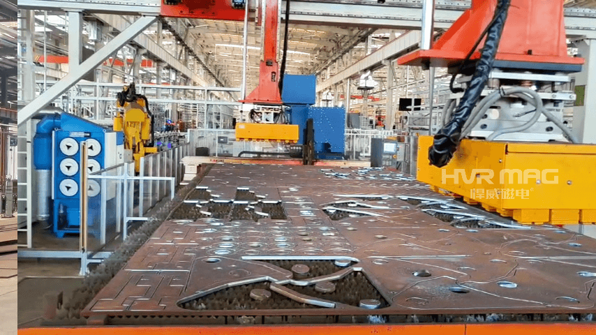 第一种解决方案是采用智能行车+电永磁吊具的组合形式,这是目前中小船厂应用最广泛、性价比最高的一种方式。这种方案无需对现有车间进行大规模改造,只需在原有行车基础上升级为智能行车,搭配钢板切割专用的悍威电永磁吊具,就能快速实现钢板自动化上下料。在钢板切割上料环节,电永磁吊具通过PLC控制系统精准发力,可根据钢板的厚度、重量智能调节磁力,实现单张钢板的精准吸吊,有效避免多张钢板粘连吸附的问题,确保上料精准高效。待钢板切割完成后,电永磁吊具可一次性完成整板零部件的整体下料,摆脱了对人工的依赖——再也不用工人蹲在激光切割平台旁一点点捡料,激光切割机可实现24小时不停机连续作业,大幅提升生产效率。而且悍威磁电生产的电永磁吊具,仅充退磁瞬间1-2秒耗电,全程节能又安全,哪怕遭遇突发断电,也能牢牢吸附钢板,杜绝高空坠落隐患,完全适配船厂复杂的作业环境。