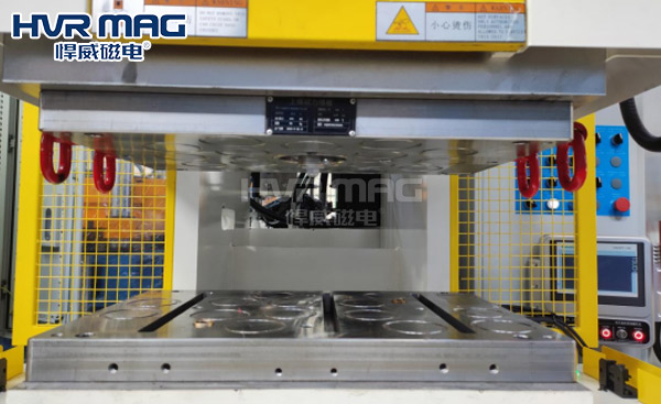 据了解,我们的客户是一家专业橡胶机械生产商,主要的产品有固态及液态橡胶注射成型机、注压机、抽真空平板硫化机、丁基胶塞机、油封成型机等等。该企业生产的注塑机广泛应用于橡胶制品生产领域,产品生产趋向于小批量、高混合度的方式让模具更换频繁,而之前采用的磁力模板由于前期没有沟通到位,造成设计错误,客户在使用过程中时常会出现掉模的问题,严重影响了整个注塑机的生产加工效率,而且还存在巨大的安全隐患。为了彻底解决注塑机换模难的问题,提高注塑机的生产加工效率及安全性,该客户引进了悍威磁电的磁力快速换模系统。