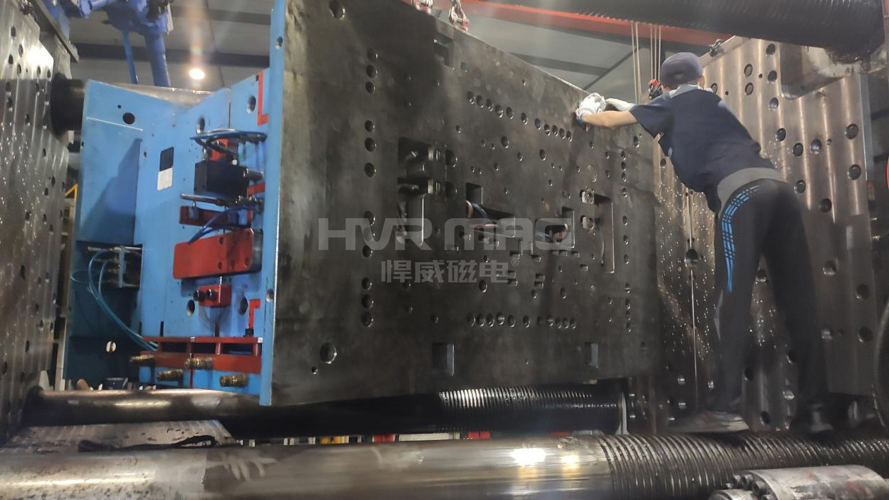 想知道大型注塑机是如何更换模具的么?是的,你没看错,下图是国内某注塑成型汽车配件厂家,安装了磁力模板的2300吨注塑机快速换模现场。